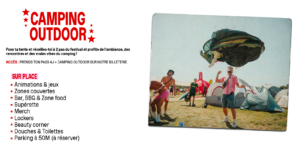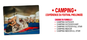 ATTENTION : UN PASS 4 JOURS + CAMPING OUTDOOR ou PASS 4 JOURS VIP + CAMPING OUTDOOR PAR PERSONNE EST NECESSAIRE POUR ACCÉDER A L’ESPACE (accès également aux douches, foodtrucks, bars et activités du camping outdoor).