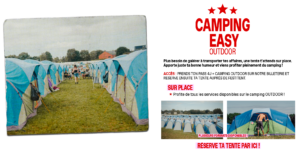Au Easy Camping, ta tente est déjà montée sur le camping Outdoor, tu n’as donc pas besoin d’en apporter une. Tu peux arriver quand tu le souhaites car ton emplacement est garanti.